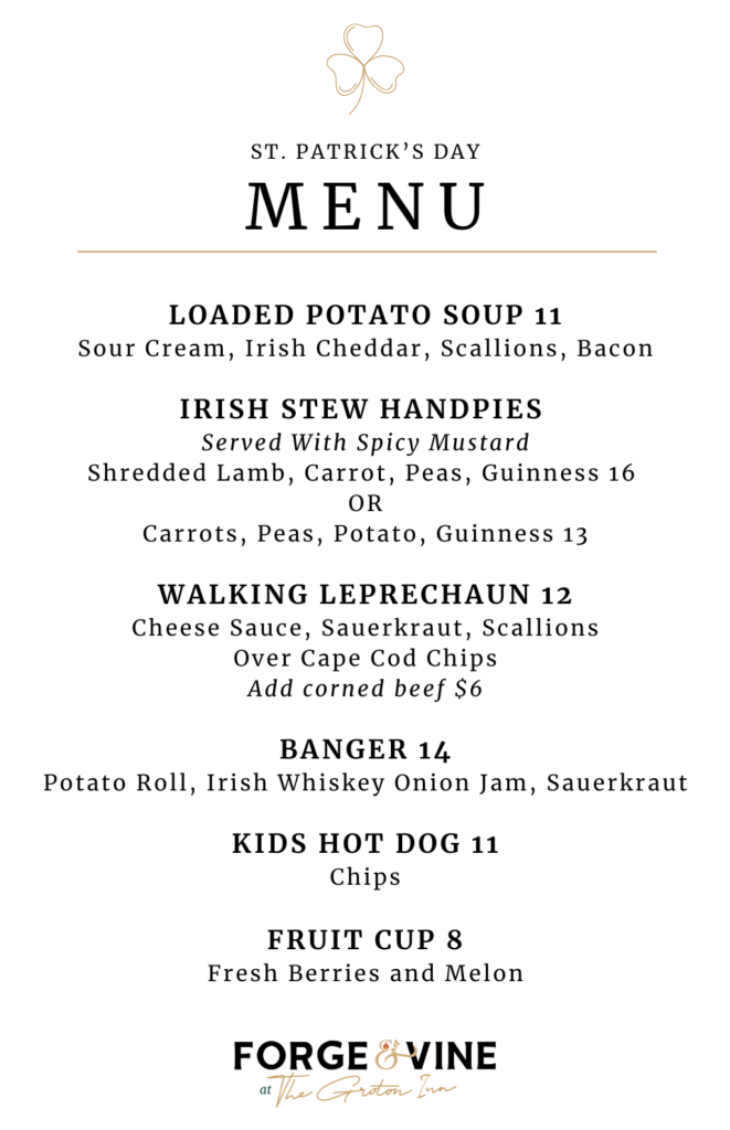 Everyone is Irish for St. Paddy’s Weekend! Join us at The Groton Inn for a day of spirited fun. Enjoy live music by John Fitzsimmons, Irish-inspired bites from the talented Forge & Vine culinary team, and festive cocktails at our full cash bar.